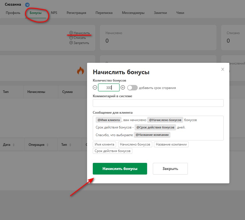 3. После получения скриншота отзыва от клиента найдите клиента в вашей базе (раздел "Клиенты"), откройте его профиль, перейдите во вкладку "Бонусы" и начислите нужное количество бонусов