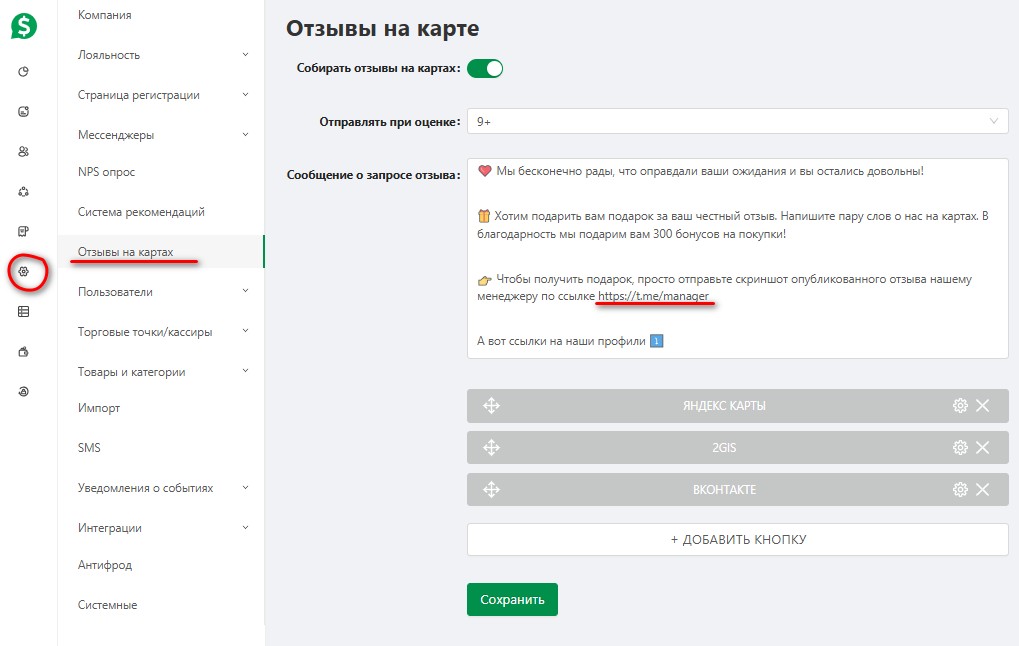 Примечание: Если ссылки на отзывы указаны в торговых точках разделе “Настройки - Торговые точки/Кассиры - Торговые точки”, то приоритет будет на торговой точке, а не на разделе “Отзывы на картах”.