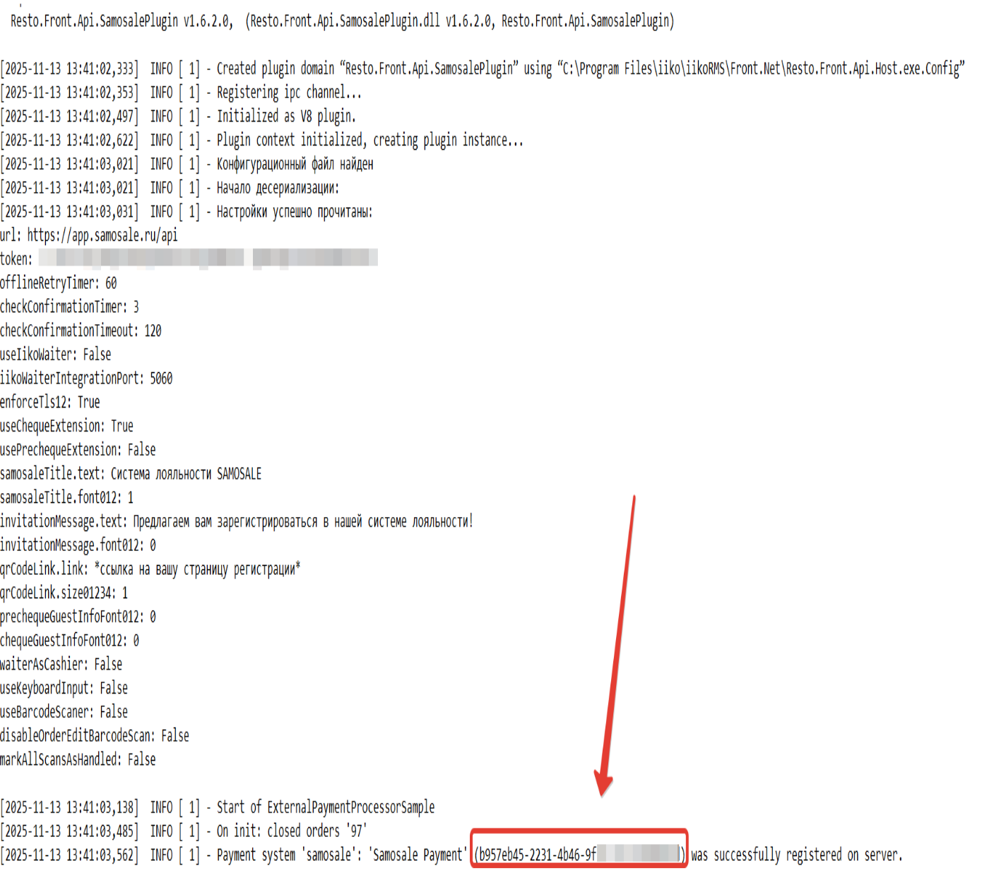 При запуске в логе плагина Samosale (plugin-Resto.Front.Api.SamosalePlugin.log) пишется ID типа оплаты (\AppData\Roaming\iiko\CashServer\Logs).