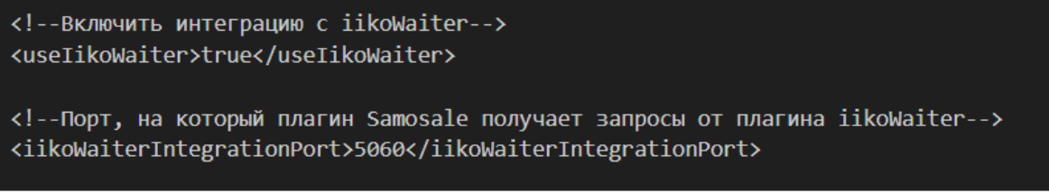 <useIikoWaiter>false</useIikoWaiter> - это использование интеграции с iikoWaiter. По умолчанию стоит false, для включения интеграции нужно поменять на true. <iikoWaiterIntegrationPort>5060</iikoWaiterIntegrationPort> - это порт, к которому будет подключаться iikoWaiter, установить - 5060.