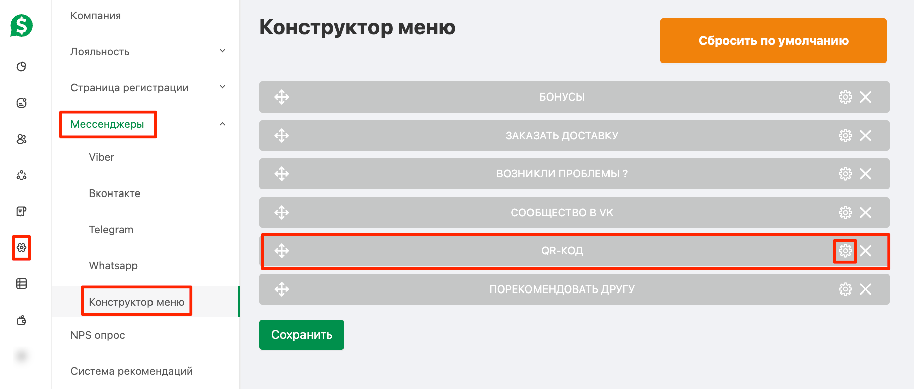 Настройки → Мессенджеры → Конструктор меню и нажмите на кнопку «QR-код».